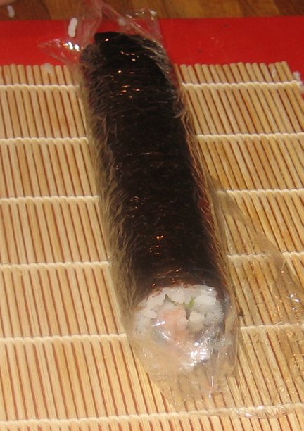 Continue rolling the sushi and pulling back the rolling mat and plastic wrap, as necessary, until you have approximately 1 to 2 inches of the top of the nori showing. Rub a small amount of cold water on the edge of the nori and bring the nori around so that it completes the sushi roll.